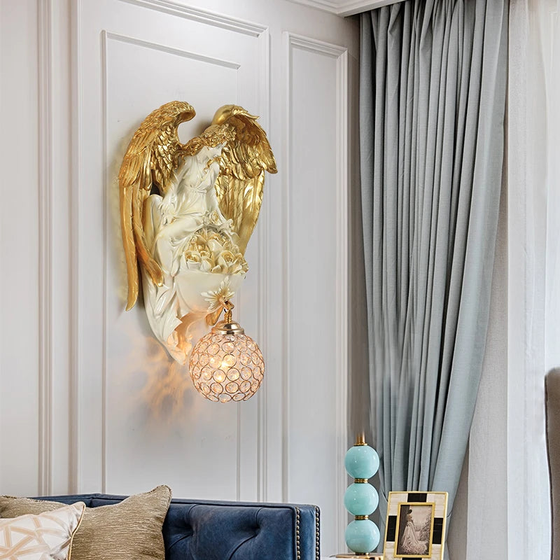 Fabriquée en résine de haute qualité et ornée de détails en cristal, cette applique murale se distingue par sa finition dorée qui capte la lumière d'une manière exceptionnelle. Ses lignes délicates et ses motifs angéliques ajoutent une dimension artistique à votre décoration. Elle est parfaite pour des intérieurs de style moderne, scandinave ou même industriel, où le mélange des genres devient un atout.