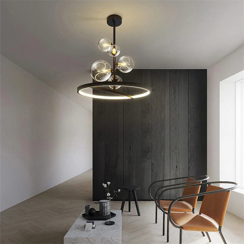 Les bulles en métal noir contrastent merveilleusement bien avec le verre transparent, créant un effet visuel des plus séduisants. Peu importe l'angle sous lequel vous regardez ce lustre, vous serez toujours émerveillé par sa beauté et son originalité.