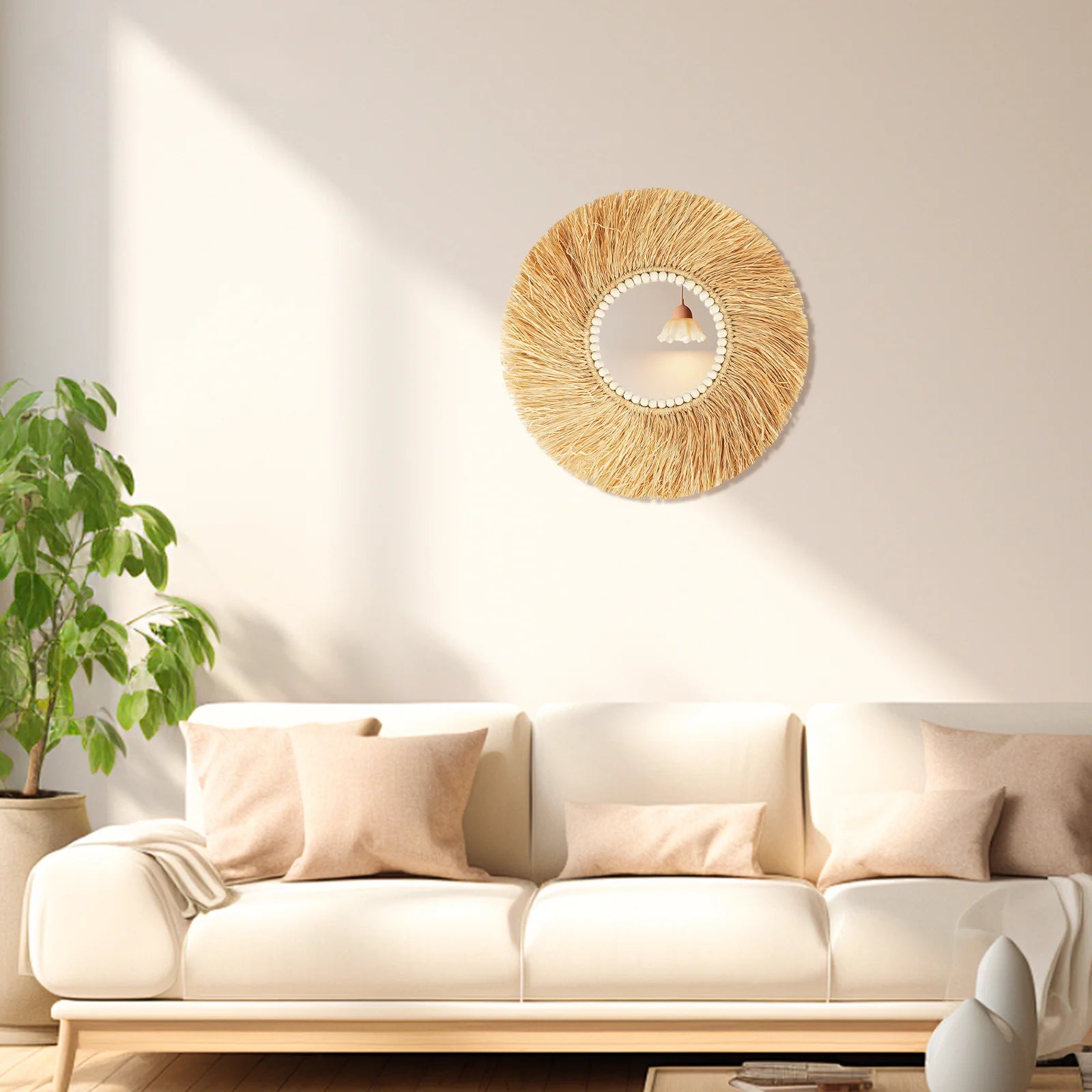 Le miroir décoratif en perles de bois de raphia se distingue par sa simplicité et son élégance. La texture naturelle des perles en bois de raphia ajoute une dimension chaleureuse, tandis que sa forme ronde crée une sensation d'harmonie et d'équilibre. Il s'agit d'un choix parfait pour les salons, où il peut devenir le point focal d'un mur, ou dans une chambre, où il apportera une touche de douceur et de sérénité.